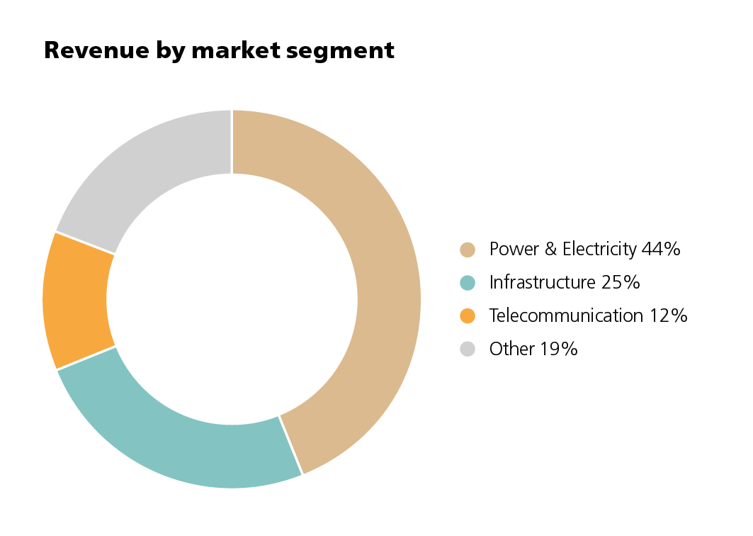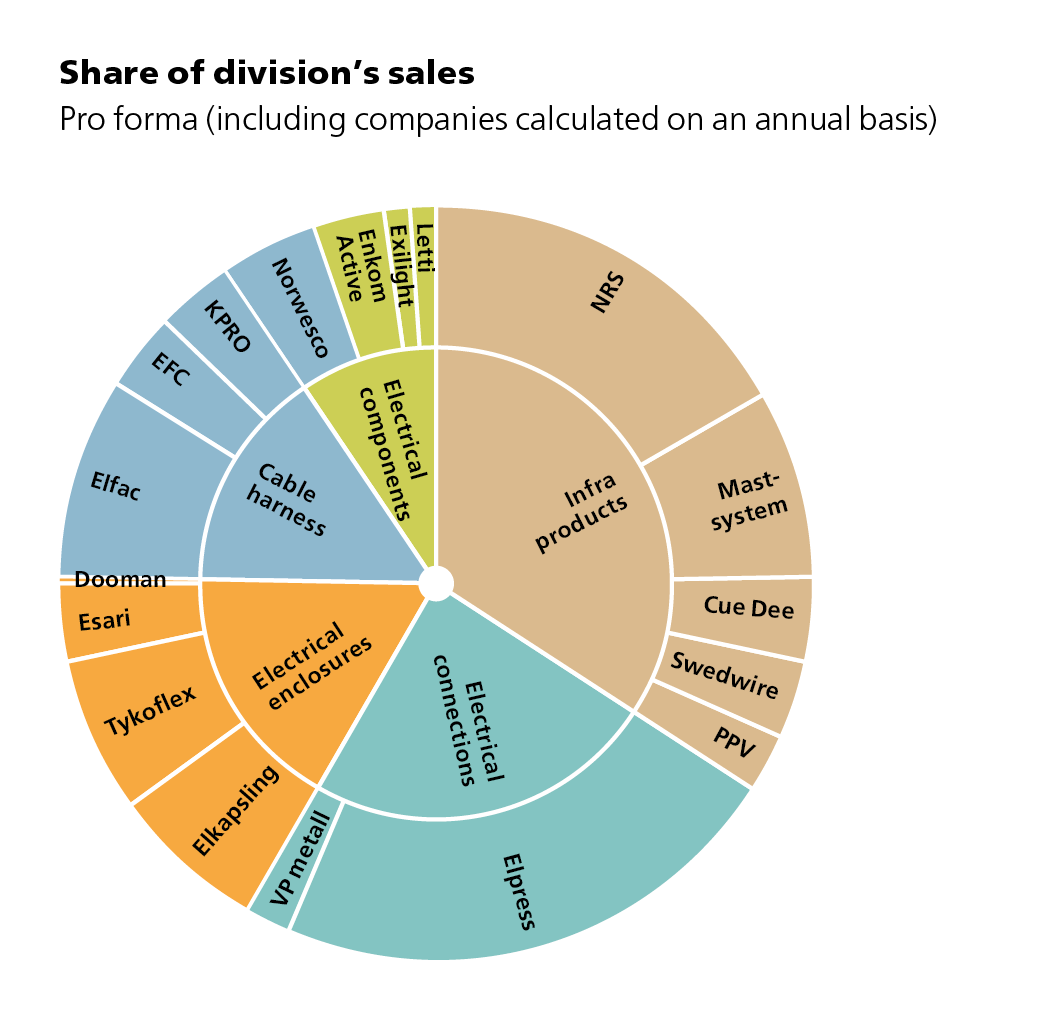The division consists of 18 companies with a strong presence in Northern Europe and a growing export business. Trends such as electrification, digitalisation and urbanisation, as well as the need for reliable communications and protected systems, are driving forces that ensure a growing market and demand. Many of the companies are leaders in their niches and show stable growth, with proprietary products and solutions that often have long lifetimes and high technical performance. Customers are found in industry, electricity distribution, transmission, renewable energy, transport infrastructure, battery and charging technologies, and communication networks such as fibre and 5G.